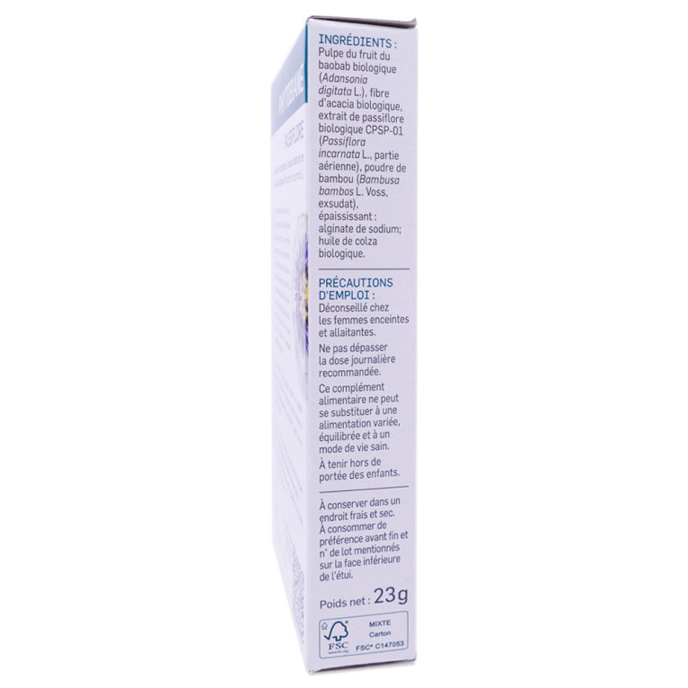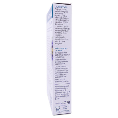 Pulpe du fruit du baobab biologique (Adansonia digitata L.), fibre d'acacia biologique, extrait de passiflore biologique CPSP-01 (Passiflora incarnata L., partie aérienne), poudre de bambou (Bambusa bambos L. Voss, exsudat), épaississant : alginate de sodium, huile de colza biologique.