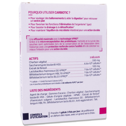 Ingrédients pour 3 gélules : Charbon végétal : 330 milligrammes Saccharomyces boulardii HS5 : 6.6x 109 cellules * Extrait de fenouil : 100 milligrammes Lactobacillus rhamnosus GG VPRO® : 7.8x 109 cellules * Bifidobacterium longum HBL79 VPRO® : 7.8x 109 cellules * Bifidobacterium lactis BL03 VPRO® : 7.8x 109 cellules **1 cellule = 1 Unité Formant Colonies (UFC)Les 4 souches probiotiques sont dosées à 30 milliards d’UFC* par jour.
