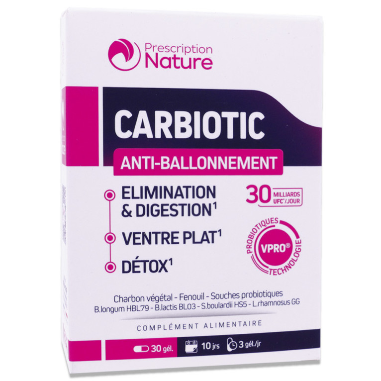 PRESCRIPTION NATURE CARBIOTIC ANTI-BALLONNEMENT 30 GELULES est disponible en vente en ligne à prix discount sur Pharmashopdiscount.