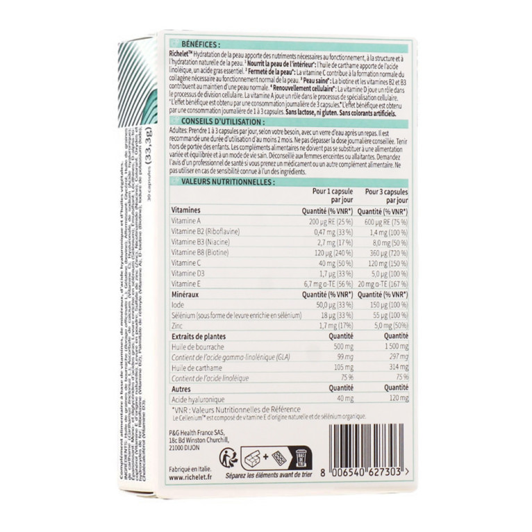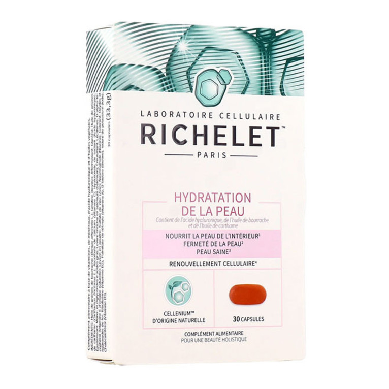Hydratation de la Peau discount du laboratoire RICHELET, un complément alimentaire en capsules à base d’huiles végétales, vitamines et minéraux pour une belle peau naturellement, dans votre parapharmacie en ligne à prix discount.