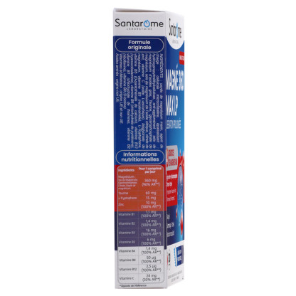 Le laboratoire Santarome propose une formule avancée qui associe 4 sources de magnésium, reconnu pour contribuer à réduire la fatigue et au bon fonctionnement du système nerveux. Les 8 vitamines B (B1, B2, B3, B5, B6, B8, B12) et la vitamine C soutiennent le métabolisme énergétique. Le zinc participe à à une fonction cognitive normale. L'inclusion de L-tryptophane et de taurine complète cette formule pour un soutien optimal des fonctions corporelles.