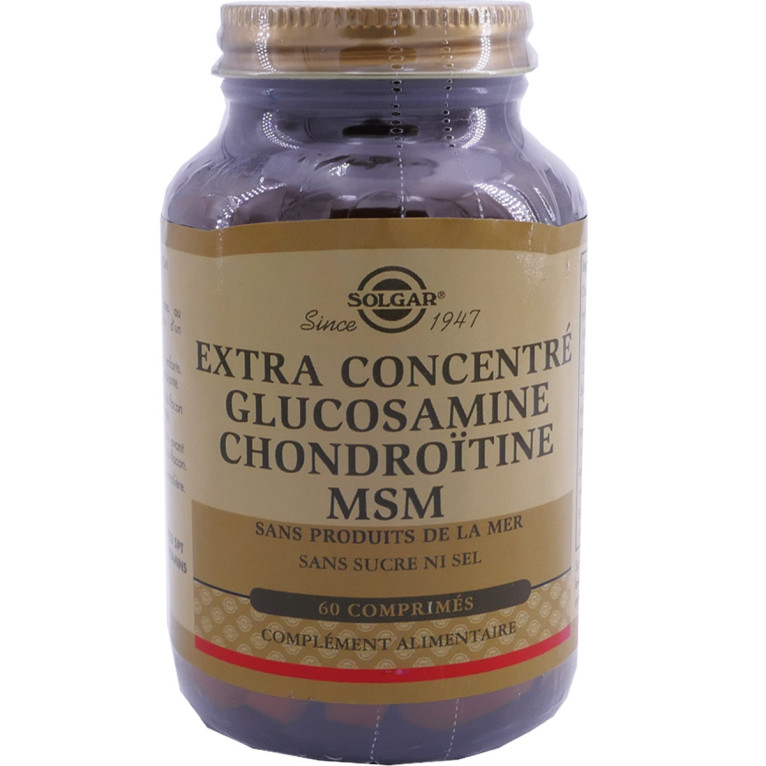 EXTRA CONCENTRE GLUCOSAMINE CHONDROÏTINE MSM de SOLGAR conditionné sous forme de comprimés est un complément alimentaire dont la teneur en Glucosamine est dosée à 620 mg par comprimé et la Chondroïtine à 600 mg. La glucosamine et la chondroïtine font partie de la famille des glycosaminoglycanes. EXTRA CONCENTRE GLUCOSAMINE CHONDROÏTINE MSM de SOLGAR fournit également du MSM (méthylsulfonylméthane) qui est une source de soufre pur. Ce complément alimentaire est garanti sans gluten sans sucre, sans colorants artificiels, sans arômes artificiels, sans conservateurs et sans produits de la mer.