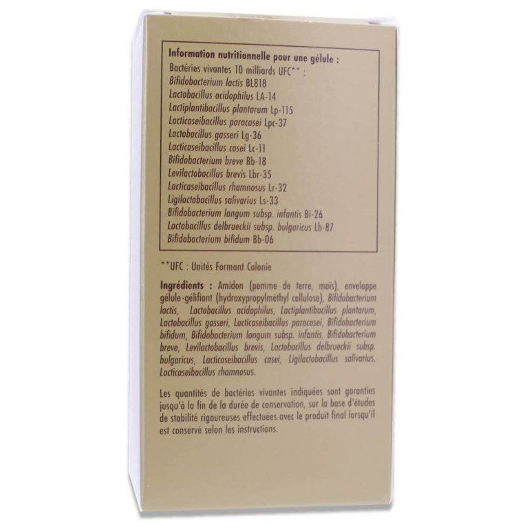 Amidon (pomme de terre, maïs), enveloppe gélule-gélifiant (hydroxypropylméthyl cellulose), Bifidobacterium lactis, Lactobacillus acidophilus, Lactiplantibacillus plantarum, Lactobacillus gasseri, Lacticaseibacillus paracasei, Bifidobacteriumbifidum, Bifidobacterium longum subsp. infantis, Bifidobacterium breve, Levilactobacillus brevis, Lactobacillus delbrueckii subspbulgaricus, Lacticaseibacillus casei, Ligilactobacillus salivarius, Lacticaseibacillus rhamnosus.