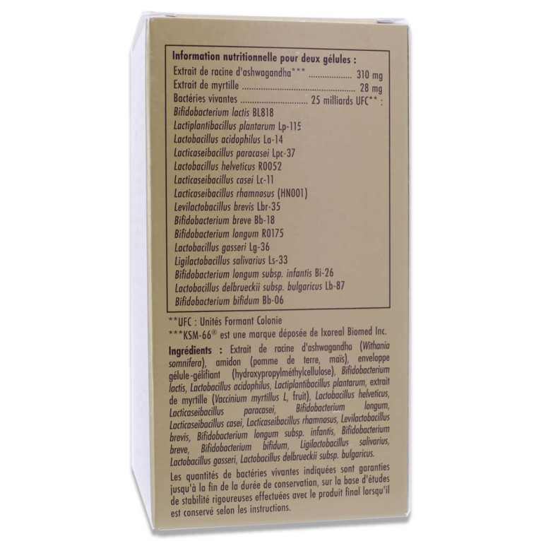 Extrait de racine d’ashwagandha (Withania somnifera), amidon de terre, maltodextrine, gélule gélifiant (hydroxypropylméthylcellulose), Bifidobacterium lactis, Lactobacillus acidophilus, Lactobacillus paracasei, Lactococcus lactis, Lactobacillus helveticus, Lactobacillus plantarum, Bifidobacterium breve, Bifidobacterium longum, Lactobacillus delbrueckii subsp. bulgaricus, Lactobacillus brevis, Lactobacillus gasseri, Ligilactobacillus salivarius, Lactobacillus delbrueckii subsp. bulgaricus.UFC : Unités Formant Colonie