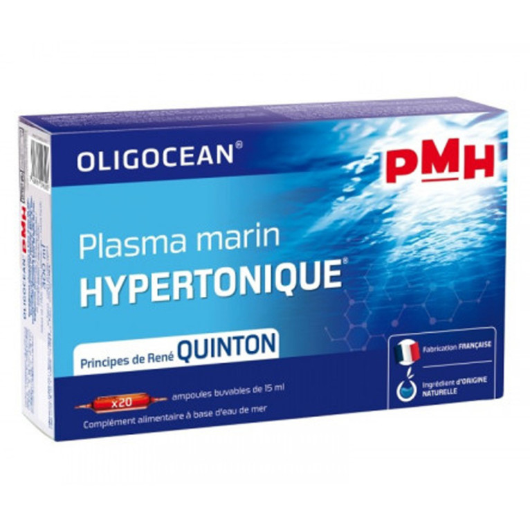OLIGOCEAN PLASMA MARIN HYPERTONIQUE 20 Ampoules est un complément alimentaire à base d'eau de mer, fabriqué en France, selon la méthode de René Quinton. L'eau de mer contenue dans ces ampoules est composée d'oligo-éléments et de minéraux.