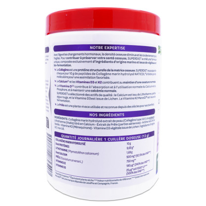 Superdiet, reconnu pour ses formulations naturelles et efficaces, propose ce complément alimentaire avec du collagène hydrolysé NATICOL, du calcium, et des vitamines D3 et K2. Le collagène est une protéine naturellement présente dans la matrice osseuse. Le calcium et les vitamines D3 et K2 participent au maintien d'une ossature normale, tandis que la vitamine D contribue à maintenir une calcémie normale ainsi qu'à l'absorption et à l'utilisation normale du calcium et du phosphore. La prêle qui est une plante vivace est utilisée depuis des siècles pour ses propriétés sur les os.