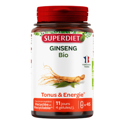 SUPERDIET GINSENG BIO 45 GELULES est en vente en ligne sur le site de votre parapharmacie à prix discount. Découvrez le Ginseng Bio de Superdiet, une formule complète et naturelle pour retrouver vitalité et tonus.
