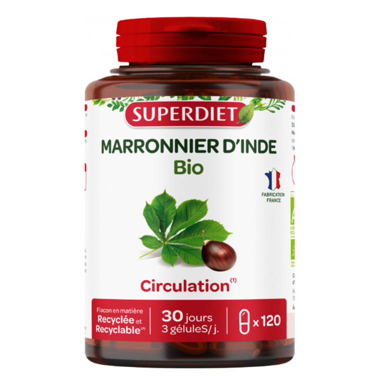 Une formule 100% naturelle pour conserver la sensation de jambes légères et à maintenir un confort circulatoire. Superdiet est une marque spécialisée dans les compléments alimentaires à base de plantes. Le Marronnier d'Inde Bio est un complément alimentaire à base de Marronnier d'Inde, qui contient des flavonoïdes et tanins. Le Marronnier d'Inde aide à maintenir une circulation sanguine saine et aide à maintenir une bonne circulation veineuse dans les jambes. Il permet de conserver la sensation de jambes légères. Ce complément alimentaire est adapté aux personnes véganes et réservé aux adultes. Les gélules sont 100% naturelles. Elles sont faciles à prendre et à digérer. Elles sont également adaptées aux végétariens et aux végétaliens. Elles sont disponibles sur le site de votre parapharmacie à prix discount.