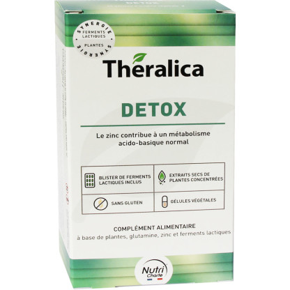 DETOX de THERALICA est un complément alimentaire sous forme de gélules, formulé à partir de plantes, de glutamine, de zinc qui contribue à un métabolisme acido-basique normal ainsi que de ferments lactiques. La formule est complétée par du chardon marie ainsi que de la poudre de feuille de desmodium.