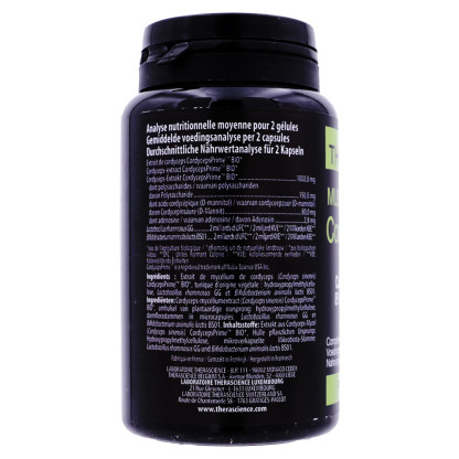 Le laboratoire THERASCIENCE propose une formule innovante avec l'association exclusive de CordycepsPrimeTM, un extrait de mycélium de Cordyceps sinensis (souche CS-4) BIO, et de probiotiques Probio-Protect®. Le Cordyceps sinensis cultivé par fermentation, est titré à 15% en polysaccharides, 8% en acide cordycépique et 0,28% en adénosine. Les probiotiques microencapsulés Probio-Protect® soutiennent l'équilibre de la flore intestinale, participant ainsi au confort digestif. Ces gélules sont gastro-résistantes et 100% végétales, assurant une absorption optimale des actifs.