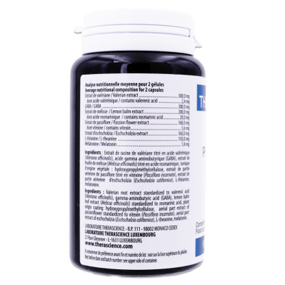 Le laboratoire THERASCIENCE propose une formule innovante pour ceux qui cherchent à soutenir un sommeil de qualité. La mélatonine, connue pour contribuer à réduire le temps d'endormissement* et à atténuer les effets du décalage horaire**, est associée au GABA (acide gamma-aminobutyrique) et à la L-théanine naturelle issue du thé vert. Chaque gélule contient des extraits de plantes : la valériane favorise le sommeil et contribue à une relaxation optimale, la mélisse contribue au maintien d'une humeur positive et d'un bon fonctionnement cognitif ainsi qu'à un sommeil calme et reposant, et l'eschscholzia contribue à soutenir la relaxation et à améliorer la qualité du sommeil naturel. Cette synergie d'ingrédients est conçue sans accoutumance ni dépendance, offrant une solution naturelle pour ceux qui souhaitent soutenir le fonctionnement normal de leur sommeil. Laissez-vous séduire par cette formule unique et faites l'expérience d'un sommeil serein et réparateur dès aujourd'hui.