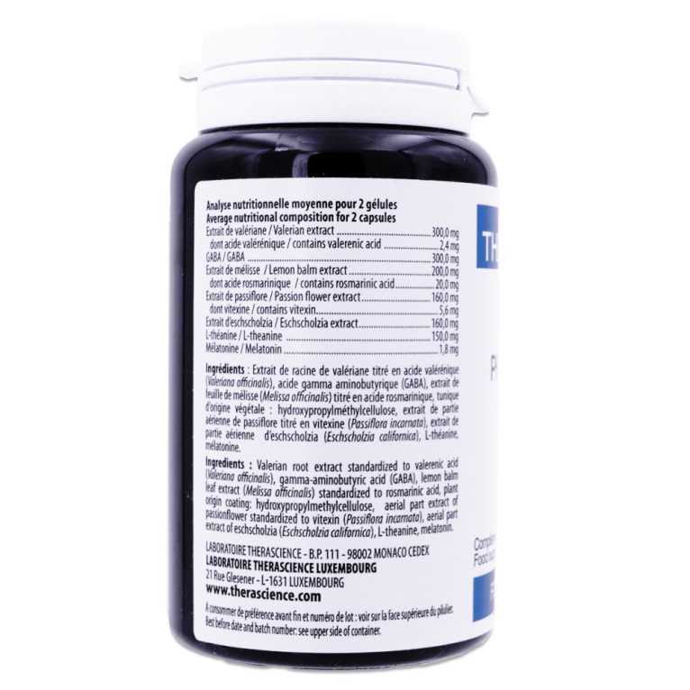 Extrait de racine de valériane titré en acide valérénique (Valeriana officinalis), acide gamma aminobutyrique (GABA), extrait de feuille de mélisse (Melissa officinalis) titré en acide rosmarinique, tunique d'origine végétale : hydroxypropylméthylcellulose, extrait de partie aérienne de passiflore titré en vitexine (Passiflora incarnata), extrait de partie aérienne d’eschscholzia (Eschscholzia californica), L-théanine, mélatonine.