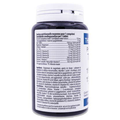 Bisglycinate de magnésium, agents de charge : carbonate de magnésium et cellulose microcristalline, vitamine C (acide L ascorbique), extrait de gomme-résine de Commiphora mukul titré en guggulstérones, agent de charge : phosphate tricalcique, vitamine E naturelle (succinate acide de D-alpha-tocophérol), fructo-oligasaccharides, anti-agglomérant : acides gras, sélénométhionine, citrate de zinc, vitamine B9 (acide folique), agents d'enrobage : hydroxypropylméthylcellulose, acides gras et cellulose microcristalline, vitamine B6 (pyridoxine HCl), vitamine B2 (riboflavine), vitamine B1 (thiamine HCl), iodure de potassium.