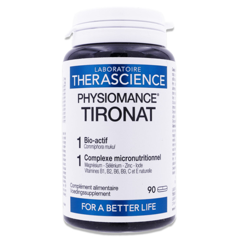 Le laboratoire Thérascience propose une gamme de compléments alimentaires de haute qualité. Physiomance Tironat associe des ingrédients soigneusement sélectionnés pour soutenir le fonctionnement de la thyroïde : La Commiphora mukul, un bio-actif, est connue pour maintenir un équilibre sain des hormones de la thyroïde ; Le complexe micronutritionnel inclut du magnésium sous forme de bisglycinate pour une biodisponibilité optimale, ainsi que du sélénium breveté Lynside® Forte Se+ sous forme de sélénométhionine. L'iode contribue à la production normale d'hormones thyroïdiennes et à une fonction thyroïdienne normale ; La vitamine E naturelle et le zinc soutiennent la protection des cellules contre le stress oxydatif. Les vitamines B1, B2, et C participent au métabolisme énergétique normal, tandis que la vitamine B6 contribue à réguler l'activité hormonale. La vitamine B9 contribue à diminuer la fatigue.