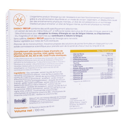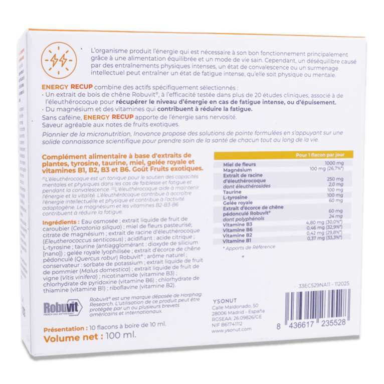 Complément alimentaire à base d'extraits de plantes, tyrosine, taurine, miel, gelée royale et vitamines B1, B2, B3 et B6.au osmosée ; extrait liquide de fruit de caroubier (Ceratonia siliqua) ; miel de fleurs pasteurisé; citrate de magnésium ; extrait de racine d'éleuthérocoque (Eleutherococcus senticosus) ; acidifiant : acide citrique ; L-tyrosine ; taurine (antiagglomérant : dioxyde de silicium [nano]) ; gelée royale lyophilisée ; extrait d’écorce de chêne pédonculé (Quercus robur) Robuvit® ; arôme naturel ; conservateur : sorbate de potassium ; extrait liquide de fruit de pommier (Malus domestica) ; extrait liquide de fruit de vigne (Vitis vinifera) ; nicotinamide (vitamine B3) ; chlorhydrate de pyridoxine (vitamine B6) ; chlorhydrate de thiamine (vitamine B1) ; riboflavine (vitamine B2).Robuvit® est une marque déposée de Horphag Research. L'utilisation de ce produit peut être protégée par un ou plusieurs brevets américains et internationaux