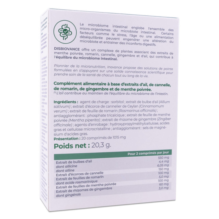 Inovance Disbiovance se compose d'ingrédients soigneusement sélectionnés pour leur efficacité, tels que les extraits de plantes, dont l'ail. Les propriétés de l'ail vont contribuer au maintien d'un bon équilibre microbien de l'intestin. Ce complément alimentaire est formulé pour soutenir la fonction digestive grâce à des ingrédients actifs qui aident au fonctionnement optimal du système digestif.