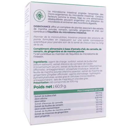 Disbiovance se compose d'ingrédients soigneusement sélectionnés pour leur efficacité, tels que les extraits de plantes, dont l'ail. Les propriétés de l'ail vont contribuer au maintien d'un bon équilibre microbien de l'intestin. Ce complément alimentaire est formulé pour soutenir la fonction digestive grâce à des ingrédients actifs qui aident au fonctionnement optimal du système digestif. Chaque comprimé est élaboré pour offrir une solution naturelle et efficace, respectant les normes de qualité européennes.