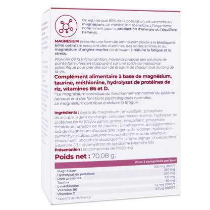Pour 2 comprimés par jour : Magnésium : 300 mg (80%*) - Hydrolysat de protéines : 250 mg - Taurine : 100 mg - L-méthionine : 60 mg - Vit. D: 5 μg (100%*) - Vit. B6: 1,4 mg (100%*) * Apport de référence