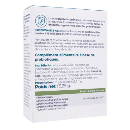 Chaque gélule Probiovance AB contient des probiotiques qui contribuent à l'équilibre de la flore intestinale. Ils participent également à l'optimisation du microbiote. Ces ingrédients sont soigneusement sélectionnés pour soutenir le fonctionnement du système digestif et favoriser une digestion sereine.
