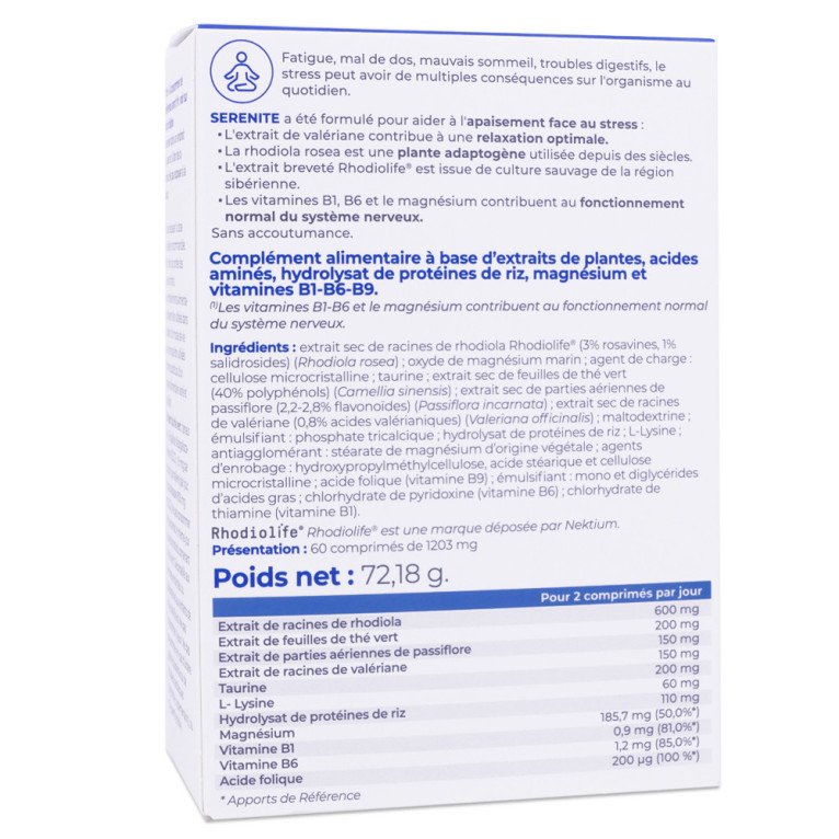 Ingrédients : extrait sec de racines de rhodiola (3% rosavines, 1% salidrosides) (Rhodiola rosea) ; oxyde de magnésium marin ; agent de charge [cellulose microcristalline] ; taurine ; extrait sec de feuilles de thé vert (40% polyphénols) (Camellia sinensis) ; extrait sec de parties aériennes de passiflore (2,2-2,8% flavonoïdes) (Passiflora spp.) ; extrait sec de racines de valériane (0,8% acides valéraniques) (Valeriana officinalis) ; maltodextrine ; émulsifiant [phosphate tricalcique] ; hydrolysat de protéines de riz ; L-lysine ; antiagglomérant [stéarate de magnésium d’origine végétale] ; agents de filmage [hydroxypropylméthylcellulose, acide stéarique, cellulose microcristalline] ; acide folique (vitamine B9) ; émulsifiant [mono- et diglycérides d’acides gras] ; pyridoxine chlorhydrate (vitamine B6) ; thiamine chlorhydrate (vitamine B1) .