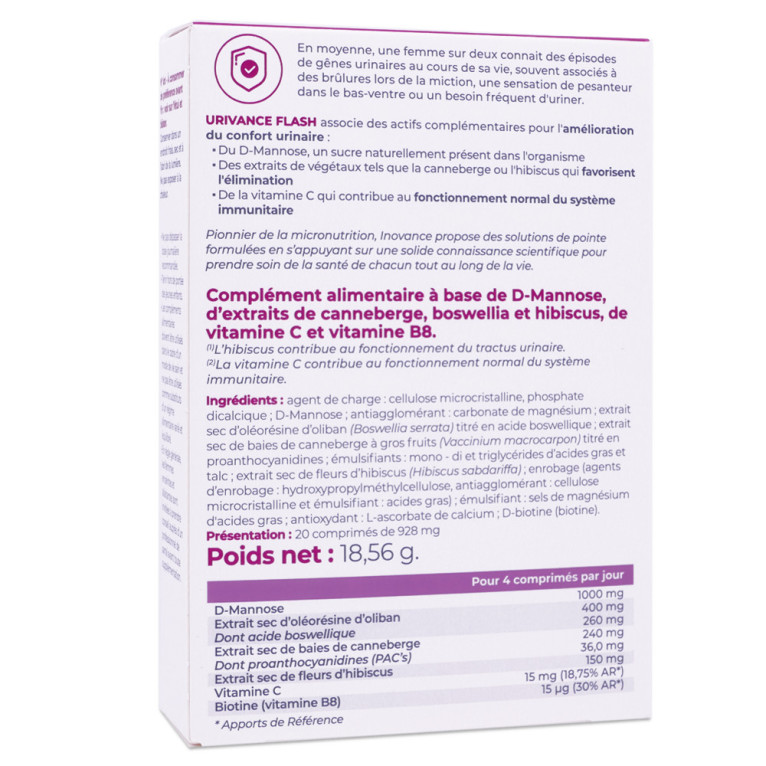 Ingrédients : Agent de charge : cellulose microcristalline, phosphate dicalcique; D-Mannose ; antiagglomérant : carbonate de magnésium ; extrait sec d’oléorésine d'oliban (Boswellia serrata) titré en acide boswellique ; extrait sec de baies de canneberge à gros fruits (Vaccinium macrocarpon) titré en proanthocyanidines ; émulsifiants : mono - di et triglycérides d’acides gras et talc ; extrait sec de fleurs d’hibiscus (Hibiscus sabdariffa) ; ingrédients d’enrobage : hydroxypropylméthylcellulose, cellulose microcristalline et acide stéarique ; émulsifiant : sels de magnésium d'acides gras ; L-ascorbate de calcium (vitamine C) ; biotine (vitamine B8).