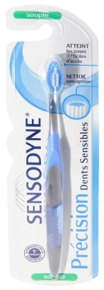 Le laboratoire SENSODYNE conçoit des produits d’hygiène bucco-dentaire pour protéger et soulager les dents sensibles au quotidien. La brosse à dents Précision possède des brins arrondis et souples qui nettoient entre les dents sans blesser tout en douceur et lutte contre l’érosion de l’émail. Sa petite tête maniable permet de ne pas blesser les gencives