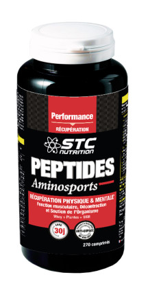 La marque STC NUTRITION à mis au point PEPTIDES AMINOSPORT, des comprimés qui contiennent pas moins de 18 acides aminés, 5 extraits de plantes ainsi, que 7 vitamines et minéraux. PEPTIDES AMINOSPORT, est formulé à partir d'extraits d'Eutherocoque qui augmentent la résistance physiologique de l’organisme en cas de conditions ambiantes sévères, et agit aussi comme tonique pour le soutient des capacités mentales et physiques en cas de fatigue; de saule qui aide à la relaxation et au bien être physique et mental, de reine des prés qui est utilisé traditionnellement pour faciliter les fonctions d'élimination de l’organisme; des vitamines B (B2, B6, B12) et du fer qui contribuent à réduire la fatigue. Enfin le Calcium complète la formule et participe à une fonction musculaire normale.