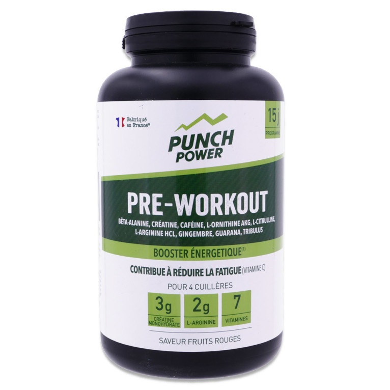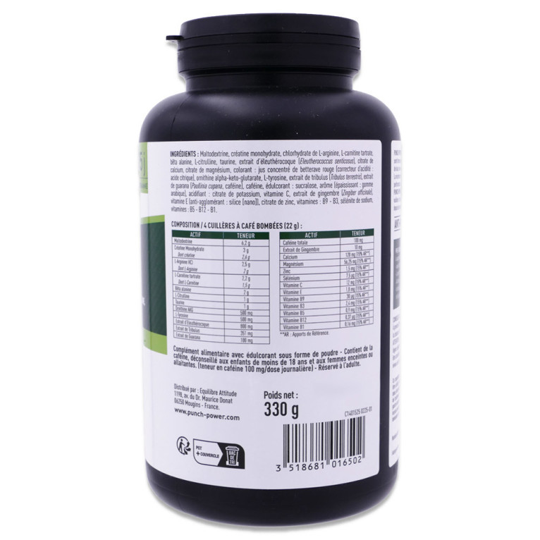 Dans 300ml d'eau, mélanger 4 cuillères à café bombées (22 g), à prendre 30 minutes avant l’entraînement. Contient de la caféine, déconseillé aux enfants et aux femmes enceintes et allaitantes (teneur en caféine 100 mg/dose journalière). À consommer de préférence avant la date indiquée sur l’emballage.
