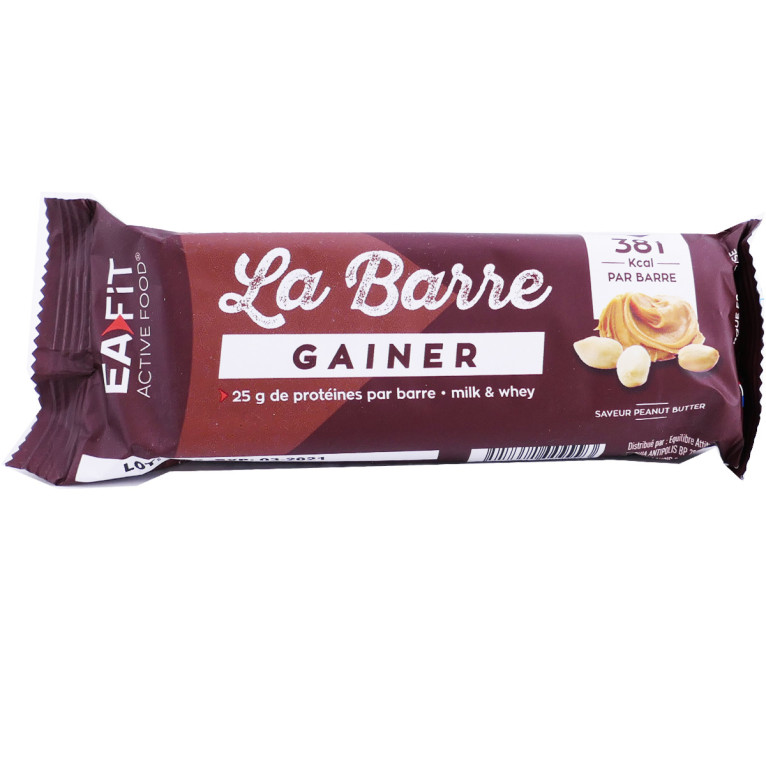 Le laboratoire EAFIT a conçu des compléments alimentaires à destination des femmes et des hommes sportifs pour améliorer les performances physiques conforme anti-dopage en partenariat avec des médecins du sport et nutritionnistes. La Barre Protéinée est un en-cas énergétique avec seulement 182kcal à prendre au quotidien, pendant le sport avant ou après, ou en période de régime alimentaire. Riche en protéines : 25g de protéines pour 385 calories par barre, ainsi qu’en vitamines et minéraux, elle va améliorer la résistance physiologique sans puiser dans les réserves, apporter de l’énergie et de la vitalité, maintenir des muscles sains, lutter contre les écarts alimentaire et contre la fatigue pendant l’effort ou lors d’un régime. Assimiler rapidement, la Barre Gainer donne des effets instantanément en apport protéinique et énergétique. Gourmande, son goût beurre de cacahuète fera de cette barre un plaisir à consommer pendant la journée. Avec édulcorants et sucres ajoutés