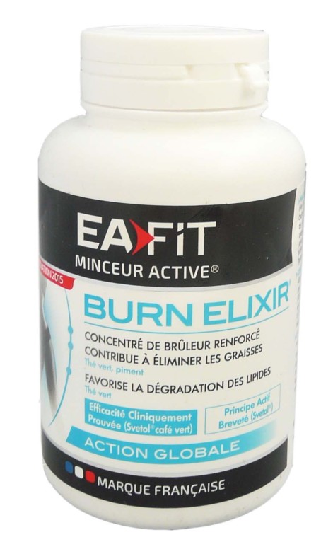 Burn Elixir d’EAFIT Minceur Active, est un complément alimentaire à base de choline, qui favorise le métabolisme des lipides, et de piment, qui aide à la perte de poids. Vient s’ajouter à ce produit le thé vert, qui contribue à prévenir l’accumulation des graisses