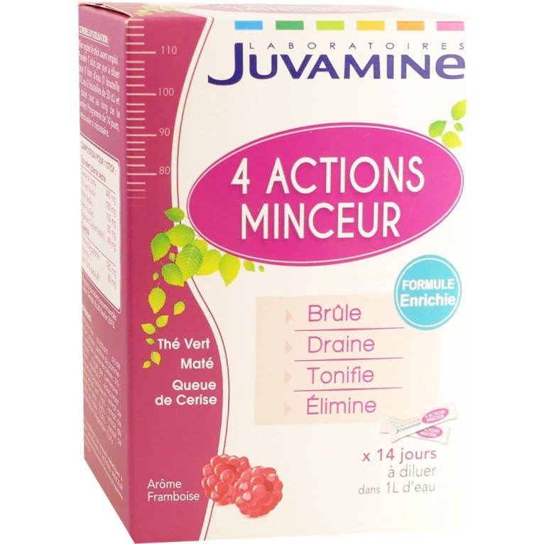 Le laboratoire JUVAMINE du groupe Juva Santé, conçoit des compléments alimentaires, infusions, vitamines,… pour le bien-être au quotidien de toute la famille (tonus, bio, minceur,…) 4 Actions Minceur est un complément alimentaire sous forme de stick à diluer aux propriétés amincissantes pour perdre les kilos superflus naturellement. Il brûle les graisses stockées, draine l’organisme pour lutter contre l’accumulation des toxines et de l’eau dans l’organisme, facilite les fonctions d’élimination, et redonne de l’énergie pendant le régime en renforçant l’organisme. Ces actions se font grâce aux extraits de plantes (queues de cerise, feuilles de maté, frêne, églantier, thé vert). Jour après jour les kilos superflus disparaissent en complément d’un régime alimentaire contrôlé, la silhouette est remodelée et s'affine. Aromatisé à la framboise, 4 Actions Minceur sera agréable à consommer.