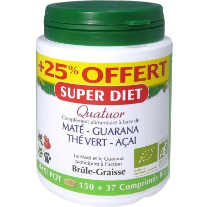 Quatuor Brûle graisse de SUPER DIET, est un complément alimentaire à base de Maté, de Guarana. Le thé vert, qui aide à garder la ligne et L’Açaï, complètent cette formule.