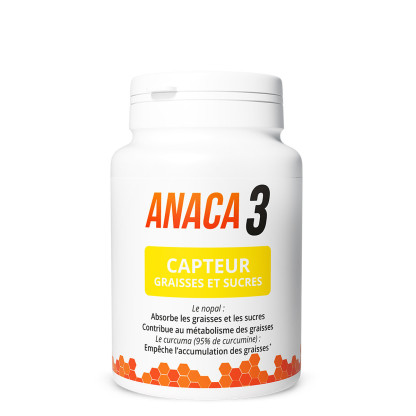 ANACA3 Capteur Graisses & Sucres est un complément alimentaire composé d'extraits de plantes (nopal, curcuma) et de 2 minéraux (chrome et zinc) qui vont par leur association agir sur l’absorption des graisses et des sucres. Le Nopal contribue au métabolisme des graisses et des sucres et le curcuma (95% de curcumine) contribue à une meilleure digestion des graisses. Des actions pour un meilleur contrôle du poids, dans le cadre d’un régime minceur
