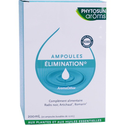 PHYTOSUN AROMS Aromadétox Élimination discount, l’expertise en aromathérapie dans votre parapharmacie en ligne à prix discount, dans un complément alimentaire sous forme d’ampoules indiqué pour détoxifier l’organisme et favoriser le bien-être du foie.