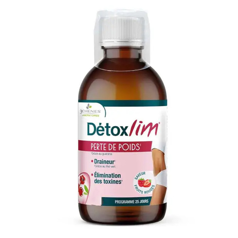 Les laboratoires 3 chênes développent depuis 1993 des compléments alimentaires et des produits cosmétiques aux formules innovantes et efficaces, élaborés à partir d’actifs naturels et biologiques, dédiés à la beauté, au bien-être de la famille. Detoxlim Perte de poids est un complément alimentaire sous forme de solution buvable saveur Fruits Rouges. Sa formule est à base de 4 extraits de plantes (guarana, cassis, queue de cerise caroube). Ainsi le guarana facilite l'amincissement dans le cadre d'un régime minceur et contribue à stimuler la dégradation des lipides. La saveur fruits rouges permet une prise agréable de Detoxlim Perte de poids.