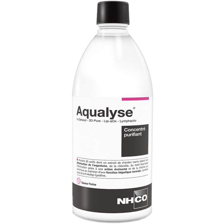 AQUALYSE est une boisson à diluer au goût de fraise spécialement formulée à base de pas moins de 20 actifs dont des acides aminés (N-Acétyl-Cystéine), des complexes (N-Detoxyl, Lip-aOx, 3D-Pure, Lymphactiv, et lipolytique) des extraits de plantes (thé vert, pissenlit, vigne rouge, bouleau, radis noir, mélilot, rizhome chiendent et algue chlorelle), de la choline et des vitamines (C et E). L’association de Chardon Marie et de pissenlit participe à la détoxification du foie notamment, de même que la choline qui contribue à la santé du foie. Les vitamines C et E protègent les cellules contre le stress oxydatif. Le thé vert et le maté aide à brûler les graisses et contribue ainsi à la perte de poids. AQUALYSE Concentré Purifiant de NHCO est au goût de fraise et sera un plaisir à boire.
