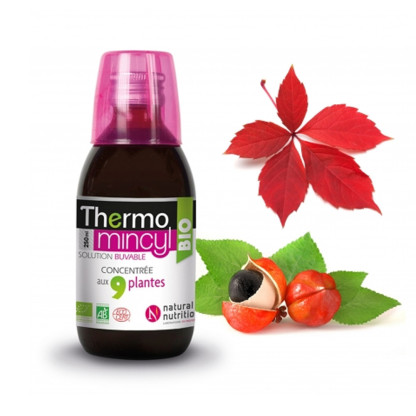Thermomincyl Bio est un complément alimentaire sous forme de solution buvable. Sa formule associe 9 extraits de plantes bio (thé vert, café vert, guarana, vigne rouge, curcuma, reine des près, citrus aurantium, écorce de pamplemousse, orange). Dans cette formule le guarana participe à faciliter l'amincissement dans le cadre d'un régime minceur et le thé vert contribue à favoriser l'élimination rénale de l'eau.