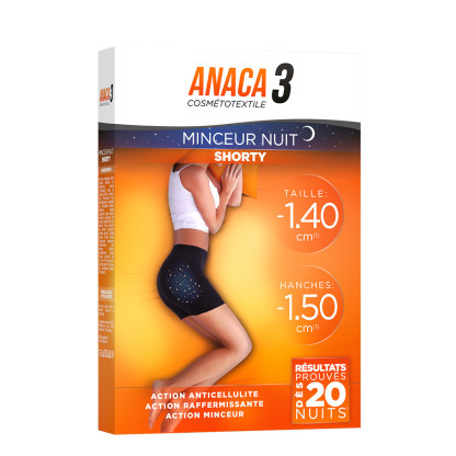 La gamme Cosméto textile d’ANACA3 est une innovation pour mincir et retrouver une belle silhouette sans effort grâce au port de vêtements ! Le Shorty Minceur Nuit Cosmétotextile composé d’un textile ultra doux, contient des actifs micro encapsulés qui en se libérant au contact de la peau par frottements vont participer à l’amincissement en diminuant le tour de taille, de cuisses, de hanches et de bassin. Ces micro capsules contiennent de l’algue rouge, de la forskoline, de la cire de blé, et du garcinia. Ces actifs naturels vont avoir des propriétés anticellulite en estompant l’aspect peau d’organge et rapffermissante en lissant la peau jour après jour. Le Shorty Minceur Nuit Cosmétotextile se porte en toute discrétion sous des vêtements. Testé cliniquement sur 20 femmes pendant 20 nuits, la silhouette s’affine, le tour de taille diminue jusqu’à 1,4cm ; les hanches jusqu'à - 1,5 cm.