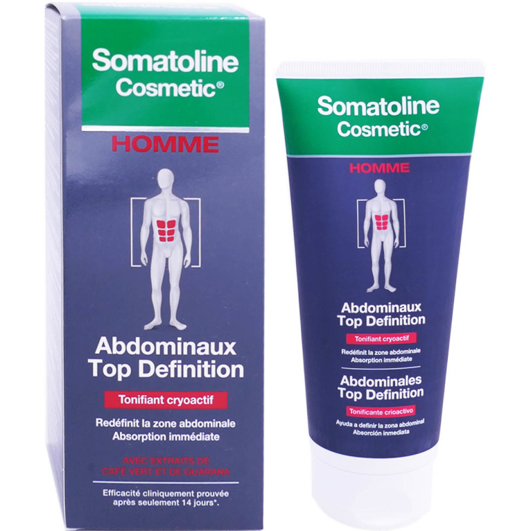 SOMATOLINE Homme Abdominaux Top définition est un soin tonifiant à base d'extraits de café vert, de guarana, de caféine, de menthol, de créatine et de carnitine capable d’agir de façon ciblée sur les amas graisseux localisés tout en tonifiant les tissus de la peau. L’efficacité minceur de ce complexe est renforcée par une action cryo-thermique (Effet - froid) qui stimule la micro-circulation sous-cutané. Des résultats cliniquement prouvés après seulement 14 jours.