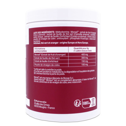 Maltodextrine ; Morosil™ : extrait de fruit d’oranger (Citrus sinensis) ; extrait de feuille de thé vert (Camellia sinensis) ; acidifiant : acide citrique ; extrait de feuille d’artichaut (Cynara scolymus) ; arôme naturel ; poudre de vinaigre de cidre ; antioxydant : phosphate tricalcique ; édulcorant : sucralose.