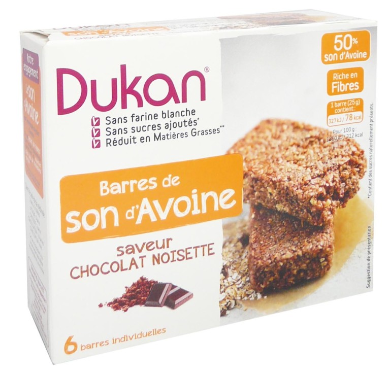 Les barres de son d’avoine de DUKAN, le petit en-cas gourmand au son d’avoine à consommer dans la journée, pour aider à mincir tout en se faisant plaisir lors d’un régime en phase de croisière ! Saveur Chocolat-Noisettes