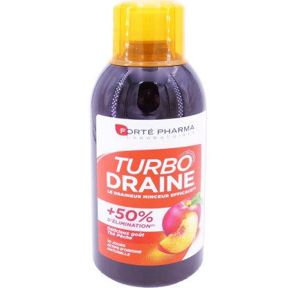 Depuis 1999, les Laboratoires FORTÉ PHARMA développent des compléments alimentaires efficaces et innovants, aux formules issues de la recherche en nutrition cellulaire, pour contribuer aux ressources quotidiennes nécessaires des utilisateurs. L’univers minceur de FORTÉ PHARMA propose des produits conçus pour favoriser la perte de poids en complément d’une alimentation adaptée et d’une activité sportive. TURBODRAINE de FORTÉ PHARMA Goût Thé Pêche est un complément alimentaire conditionné sous forme de solution buvable à diluer, spécialement formulé à base de Reine des Prés qui favorise les fonctions d’élimination rénale et le Thé vert qui stimule le métabolisme des graisses. Cette formule innovante de TURBODRAINE associe au Thé vert et à la Reine des Prés d’autres extraits de plantes: le cactinéa - fruit de figuier de barbarie, l’hibiscus et les queues de cerises. Grâce à son goût agréable, TURBODRAINE se boit sans effort tout au long de la journée. TURBODRAINE de FORTÉ PHARMA existe aussi au goût Ananas.