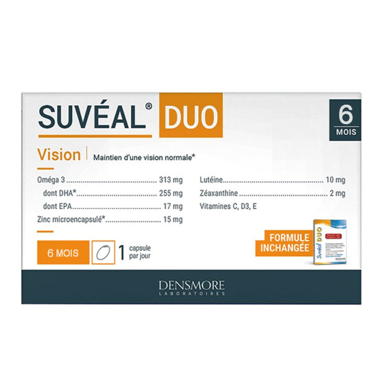 Suvéal Duo est un complément alimentaire sous forme de capsules, composé de vitamines, lutéine et Zéaxanthine (pigments naturels de la rétine), acides gras polyinsaturés (contenant du DHA) et oméga 3. Ainsi dans la formule de ce complément alimentaire, le zinc et le DHA vont contribuer au maintien d'une vision normale. Le zinc également associé aux vitamines C et E participent à protéger les cellules contre le stress oxydatif.