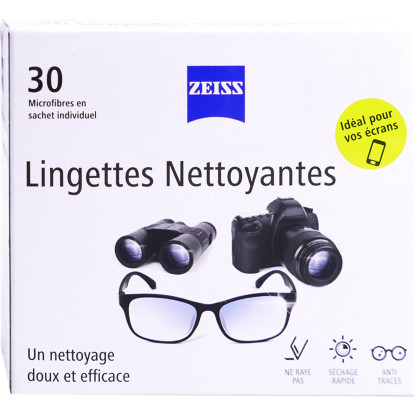 Les Lingettes Nettoyantes discount de ZEISS, un produit essentiel en format lingettes individuelles, pour nettoyer en douceur et efficacement tous les types de verres des lunettes et les surfaces optiques (appareil photo, écran ordinateur, etc.) dans votre parapharmacie en ligne à prix discount.