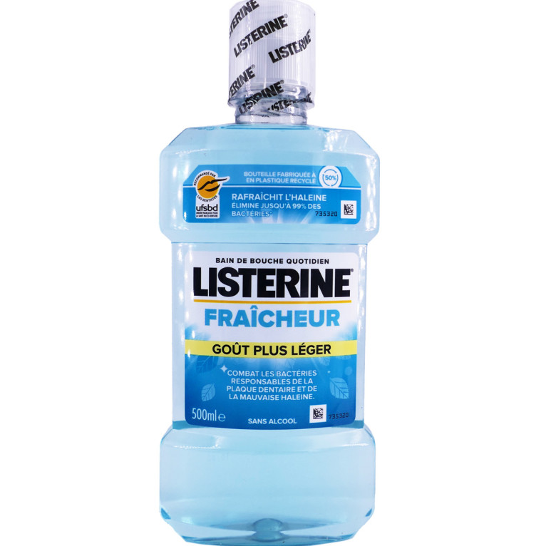LISTERINE BAIN DE BOUCHE FRAICHEUR GOÛT PLUS LÉGER 500ML. Utiliser deux fois par jour après le brossage. Ne pas avaler. Tenir hors de portée des enfants.