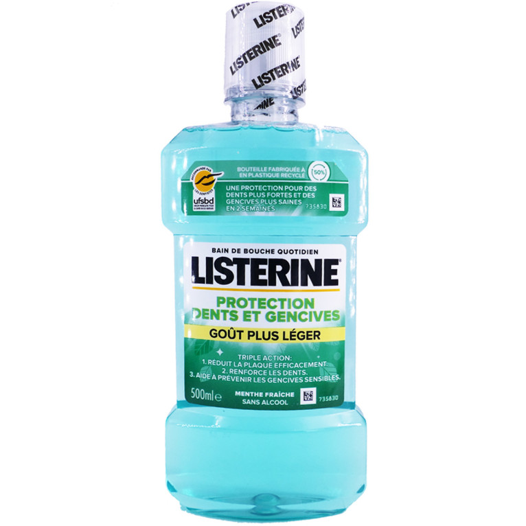 Le bain de bouche Protection Dents et gencives de LISTERINE est spécialement conçu pour assurer une hygiène bucco-dentaire quotidienne en réduisant la plaque dentaire, renforcer l’émail des dents et protéger des caries, protéger de la sensibilité gingivale et rafraîchir l’haleine durablement. LISTERINE Protection Dents et gencives, composé de fluor pour renforcer les dents, et utilisé en complément du brossage quotidien, assure un nettoyage complet notamment dans les endroits difficilement atteignables par la brosse même sous le bord des gencives. Cliniquement prouvée. Sans alcool .