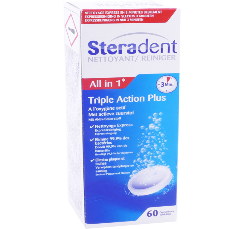 Steradent Triple Action Plus va nettoyer en profondeur les prothèses dentaire en éliminant efficacement la plaque dentaire et les bactéries. Une hygiène parfaite pendant 12h. Egalement Anti-corrosif, la prothèse dentaire est ainsi préservée.