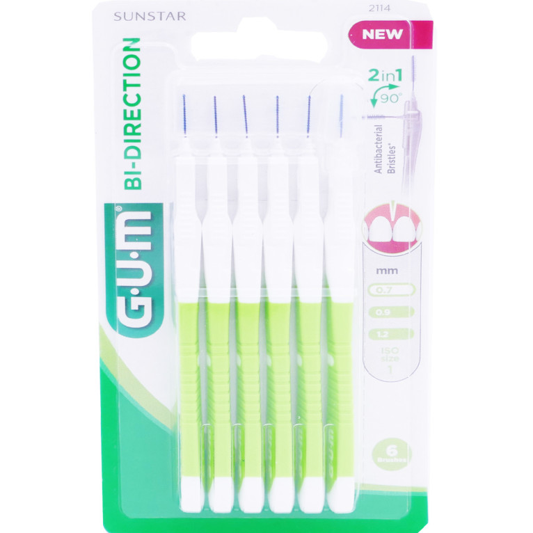 GUM Sunstar, dont le nom évoque le soleil (sun) et les étoiles (stars) puisqu’on se lave les dents au lever du jour et à la tombée de la nuit, développe depuis près d’un siècle des produits de soins buccaux et dentaires révolutionnaires de très grande qualité offrant une réponse adaptée à tous les besoins : brosses à dent, soins inter-dentaires, fils dentaires... La gamme GUM gencives propose des produits spécialement conçus pour maintenir des gencives saines et en bonne santé. Les brossettes interdentaires GUM Bi-Direction assurent un brossage simple et efficace des espaces interdentaires notamment dans les zones les plus difficilement atteignables. Elles sont dotées d’un manche semi-long avec une tête orientable à 180° idéale pour les dents de devants, et à 90° en « L » pour atteindre les dents du fond. Leur tige en nylon et arrondie est extrêmement résistante et prolonge leur durée de vie. Recouverts de chlorhexidine qui est un agent antibactérien, les brins permettent une efficacité optimale du nettoyage interdentaire et du sillon gingival. Leur brins de forme triangulaire éliminent 25% de plaque en plus qu’une brossette aux brins traditionnels. Equipées de capuchon les brossettes restent propres entre 2 utilisations. Leur manche bi-matière ergonomique permet une prise en main optimal. Disponible en trois tailles.