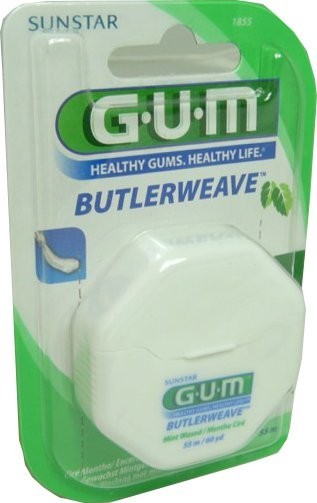 GUM Sunstar, dont le nom évoque le soleil (sun) et les étoiles (stars) puisqu’on se lave les dents au lever du jour et à la tombée de la nuit, développe depuis près d’un siècle des produits de soins buccaux et dentaires révolutionnaires de très grande qualité offrant une réponse adaptée à tous les besoins : brosses à dent, soins inter-dentaires, fils dentaires... Le fil dentaire GUM Butlerweave en complément du brossage classique, permet d’éliminer jusqu’à 70 % de plaque dentaire en atteignant notamment les zones difficilement accessibles avec une simple brosse à dent. Le fil dentaire GUM Butlerweave est doté d’un tissage unique souple et résistant, qui facilite l’élimination de la plaque dentaire entre les dents sous la ligne gingivale. Goût légèrement mentholé, fil ciré, surface de contact large.