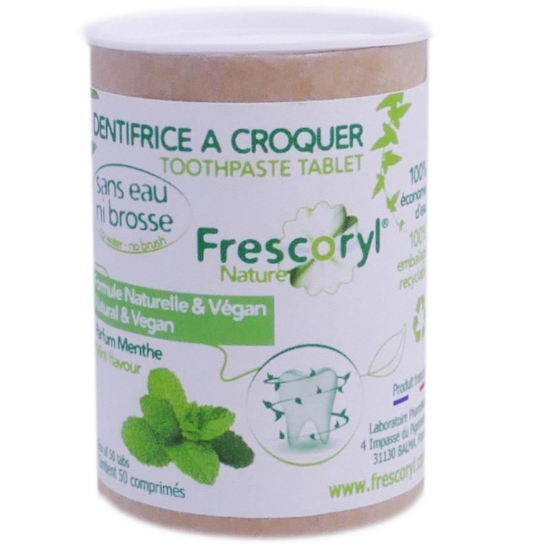 FRESCORYL est une marque du laboratoire PharmMatt destiné à l’hygiène bucco-dentaire et corporelle pratique et en format nomade pour un brossage des dents innovant sans utiliser d’eau ni de brosse à dents. Le Dentifrice à croquer est un comprimé qui remplace le dentifrice quotidien pour une utilisation pratique et nomade. Composé d’actifs antibactériens, antitaches et apaisants (bicarbonate de sodium d’origine minérale, xylitol, aloe vera, extrait d’hamamélis) il nettoie les dents et espaces interdentaires, agit pour une action blanchissante, antitache (colorations provoquées par le thé, le café, le tabac…) anti-plaque, antitartre et apaisante. En remplacement du dentifrice habituel, le dentifrice à croquer assurera une hygiène bucco-dentaire irréprochable. A la menthe, l’haleine restera fraîche. Son format permet de l’emporter partout avec soi, même en déplacement pour un nettoyage des dents à tout moment. Sans paraben ni fluor